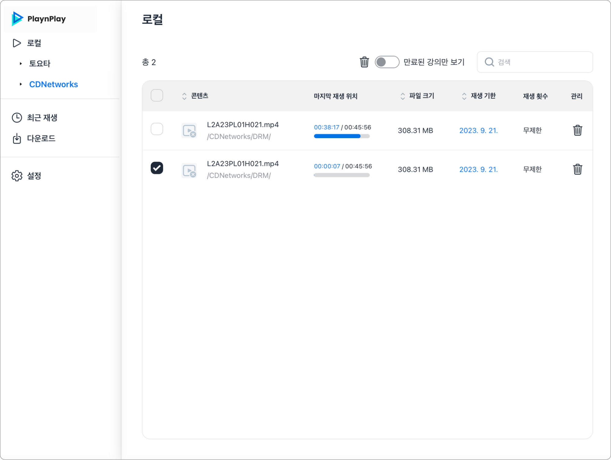 PlaynPlay 앱은 스트리밍 재생, 배속, 구간 반복, 워터마크 등의 다양한 동영상 플레이어 기능, 화면 녹화 차단 및 방지 기능, DRM 콘텐츠를 다운로드 및 관리할 수 있는 기능들을 제공합니다.